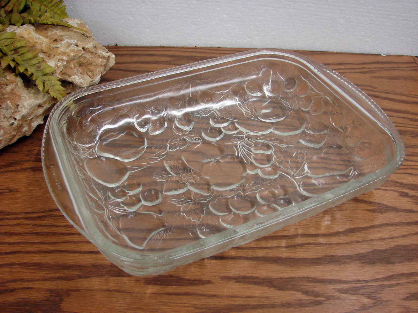 Vintage Clear Libby Orchard Fruit heavily embossed rectangular pan that measures about 14 x 10 x 2 1/2″.   Free from damage.    Marked Oven Proof.