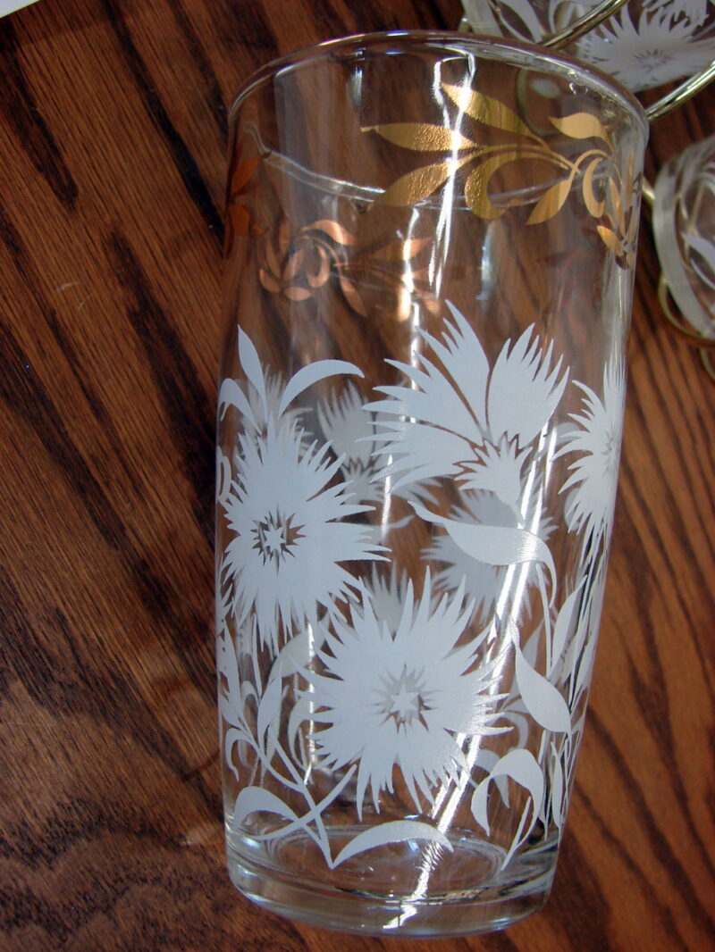 Vintage Hazel Atlas White Aster with Gold trim 12 oz tumbler glasses complete with carrier. 8 Glasses and 1 Brass carrier. Previously enjoyed and have normal wear but are free from any damage.