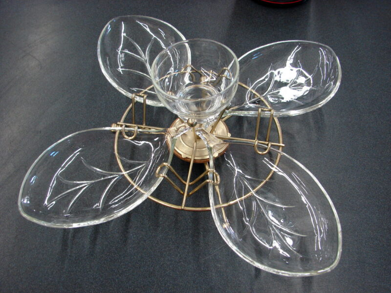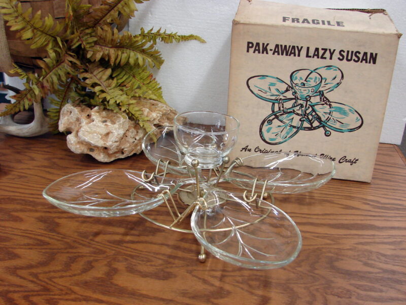 Vintage Pak-Away Lazy Susan rotating 6 piece server tray with original box. Brass holder Mfg by United Wirecraft. Chicago, IL Measures about 14″ wide when put together. Free from damage.