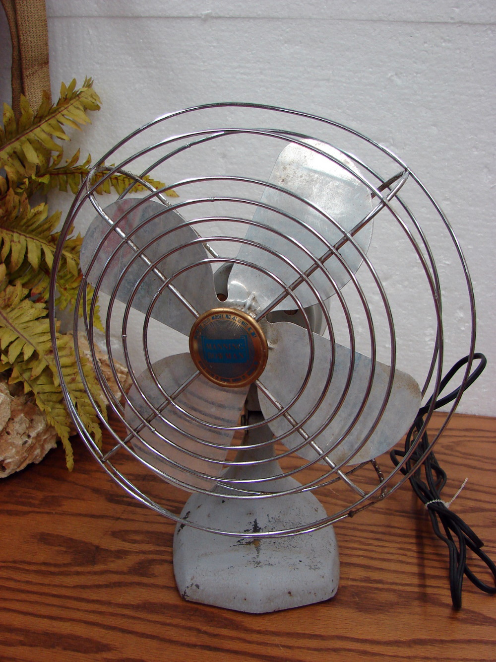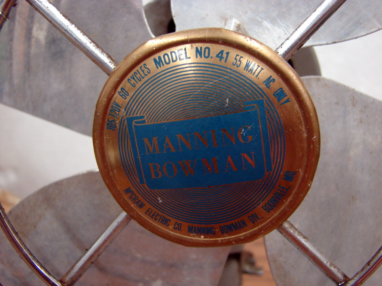 Vintage mid century Manning Bowman electric with an Art Deco cast iron base table fan.  Model 41.  Works as intended and oscillates.   Blade cage measures about 11 1/2″ wide.