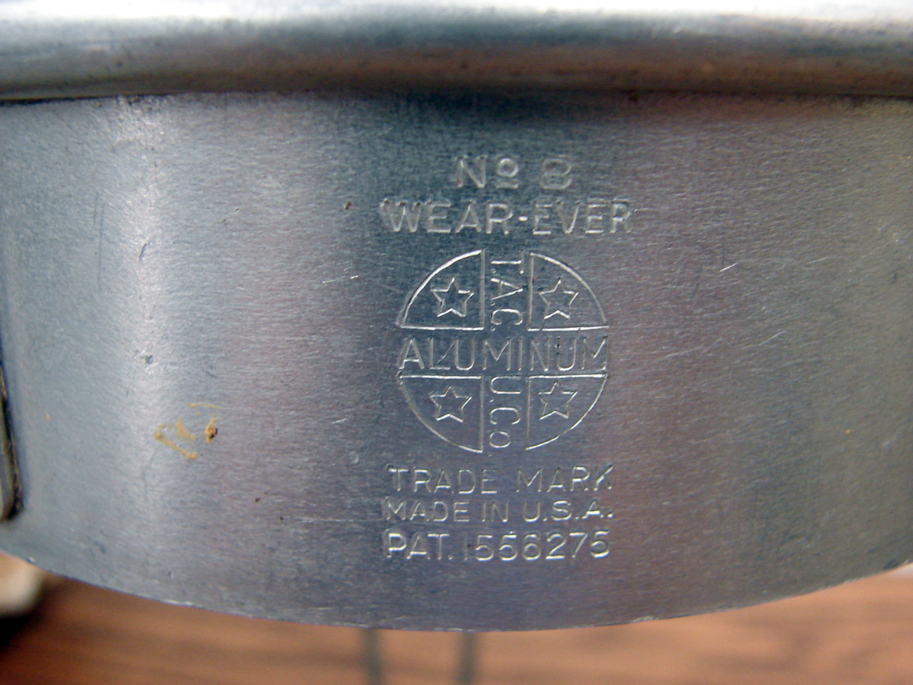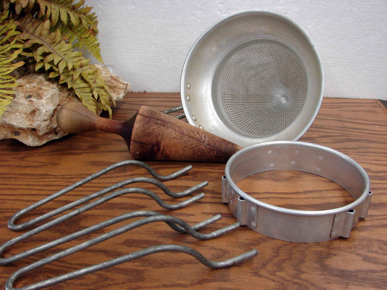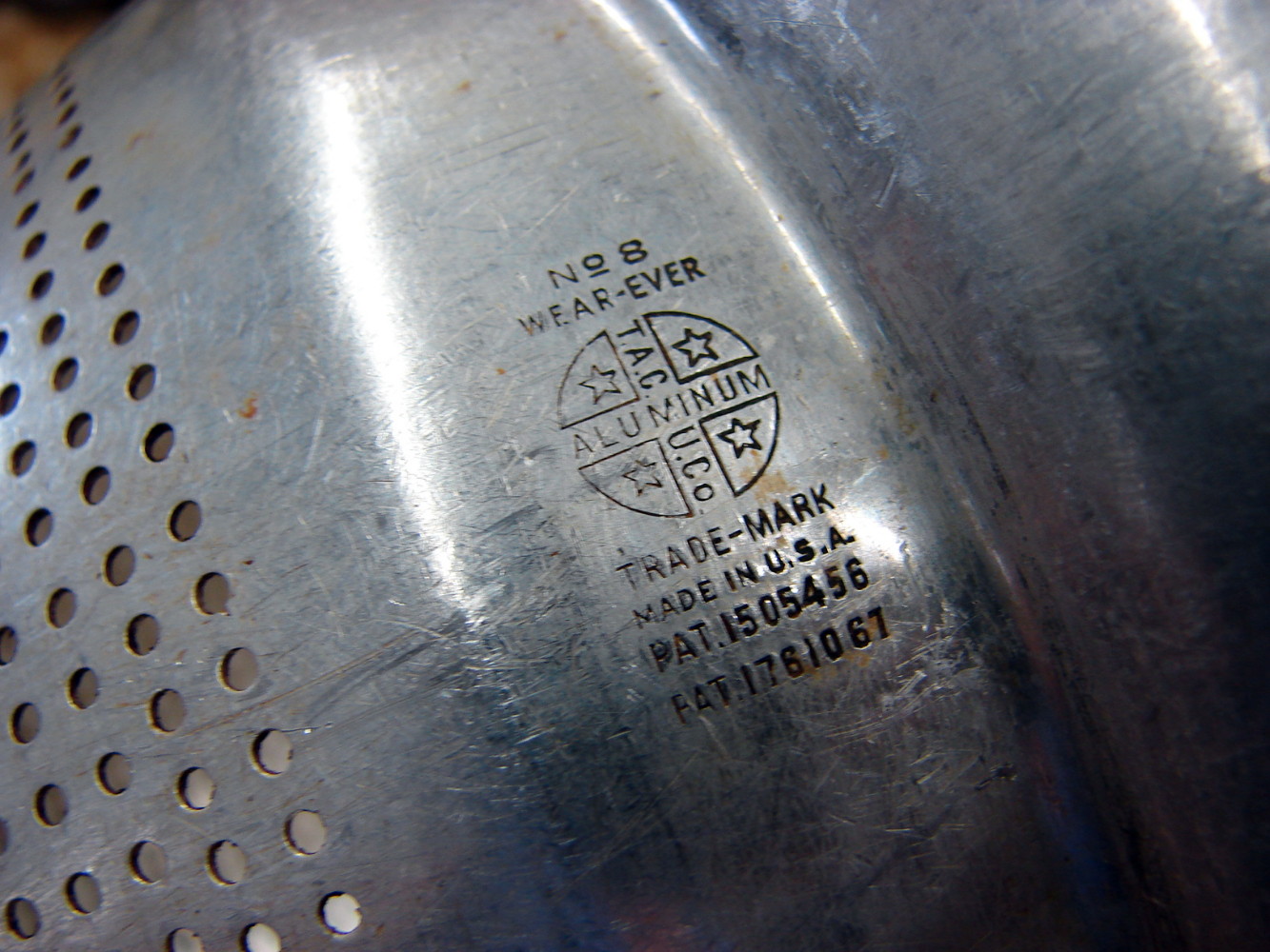 Vintage WearEver No. 8 ALuminum Sieve with wooden pestle and 3 removable leg stand. Sieve has a few dents, but does not affect the use. Measures about 8 1/2″ wide by 11″ tall. A must have for making jellies, jams and juice.