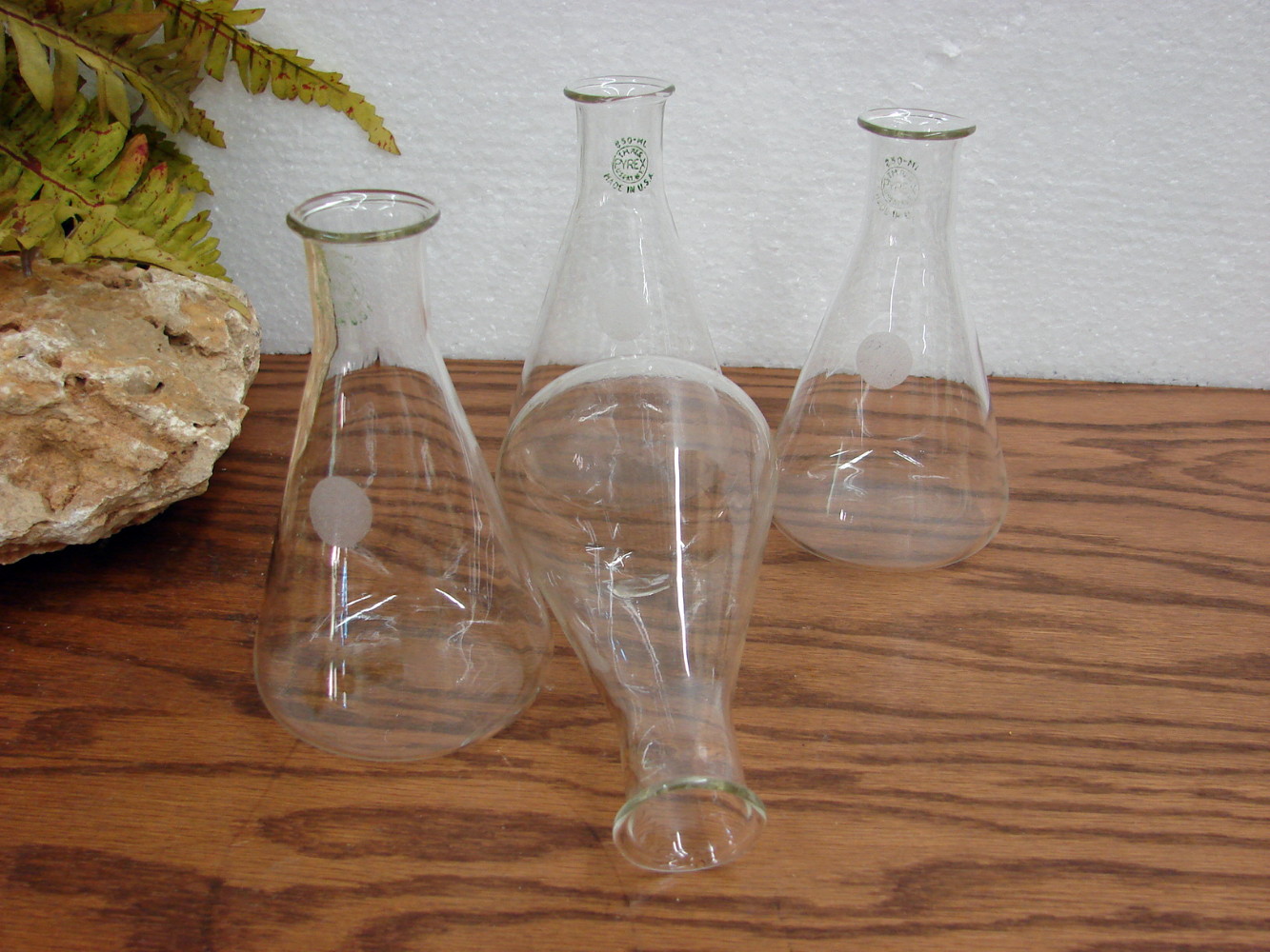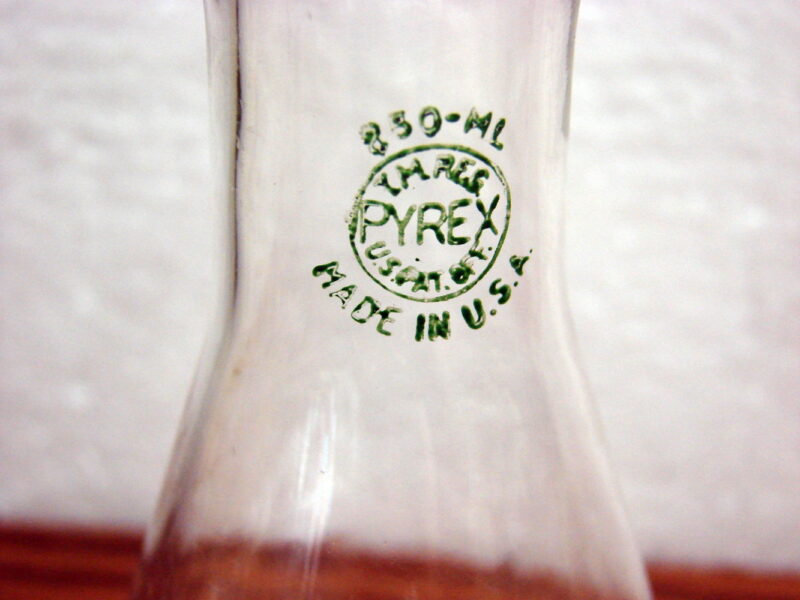 Previously enjoyed vintage PYREX 250ml Flasks with the old Green stamp. Would be perfect for bud vases in your Pyrex collection. Measure about 5 1/4″ tall by 3″ wide across the bottom. Free from damage. A set of four.